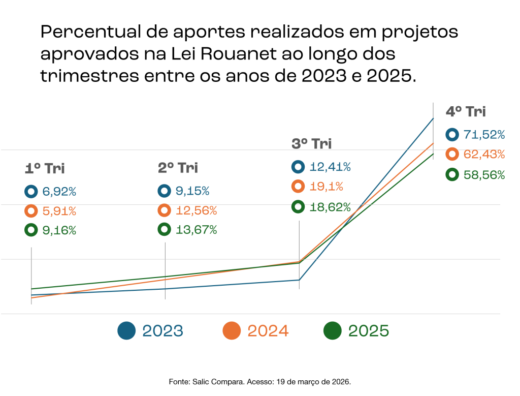 Há algum tempo, a Nexo tem conversado com a comunidade de proponentes sobre mudanças no comportamento de investimentos incentivados ao longo do ano. Se em 2023, os aportes feitos no quarto trimestre representavam 70% de todo o recurso captado pela Lei Rouanet, nos últimos anos, como mostramos neste artigo, os aportes realizados nos outros trimestres têm crescido. Em 2025, menos de 60% dos aportes na Lei Rouanet foram realizados no 4o trimestre.