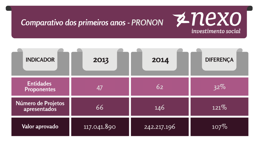 2014 foi o segundo ano de funcionamento do Programa Nacional de Apoio à Atenção Oncológica (PRONON), incentivo fiscal que permite que empresas e pessoas físicas invistam em projetos de entidades sem fins lucrativos voltados para a prevenção e combate ao Câncer.